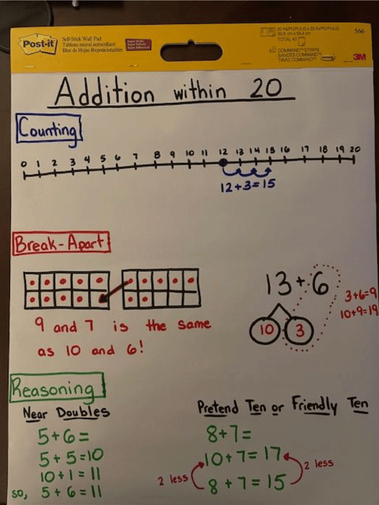 - Organize Your Strategies: Group your teaching strategies into three clear categories: Counting, Decomposing (breaking numbers apart), and Reasoning. Create an anchor chart for students to use as a reference during lessons, practice, and even assessments. Using these categories across different units helps students generalize their learning.